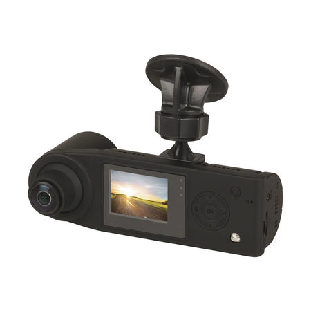 This dual dash camera has forward and rear facing cameras with 190° wide angle lenses to capture a 360° view of any incidents that may happen inside or outside of your vehicle. Video recordings with audio are recorded in 1080P high definition to a microSD card (available separately), which can be played back on the integrated 1.5” colour display or on your computer to see what really happened.