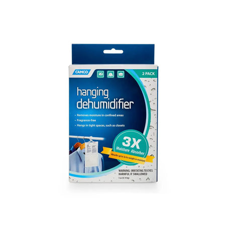 The Camco Hanging Dehumidifier is an easy way to reduce humidity in small, tight spaces such as closets or storage areas. The double packet of moisture-absorbing media features a convenient hanger on top for hooks or clothing racks. The moisture-absorbing agent acts fast to trap humidity and the fragrance-free beads do not impart any scent. One packet of media will absorb up to three times its weight in water and lasts up to one month. Contains two hanging dehumidifiers.