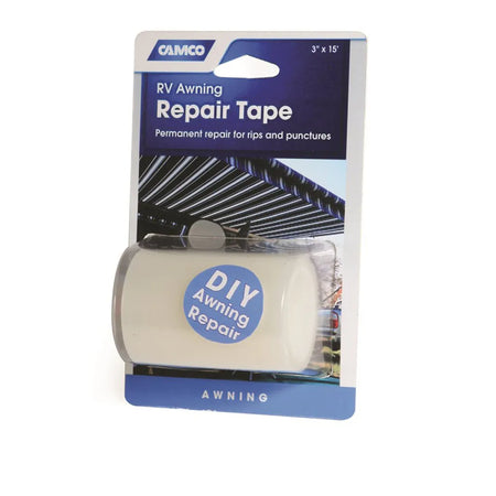 Camco's RV Awning Repair Tape is a permanent repair for rips and punctures on your RV awning. Use it for RV, boat sails, canvas, tents, rain wear, backpacks, popup campers and more. It has an aggressive adhesive and resists tearing in any direction.