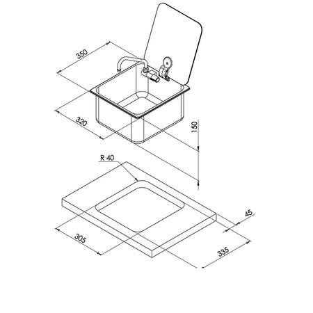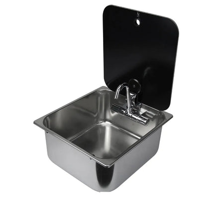 CAN, designed for function, durability, atheistics , ideal for Caravans, motorhomes, boats, horse trucks, etc. Sturdy square stainless steel sink with fold down glass lid, for added benchtop space, comes complete with a fold down tap