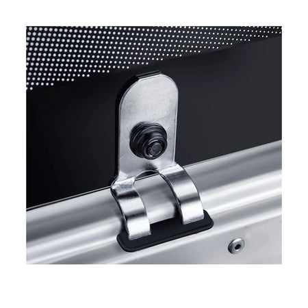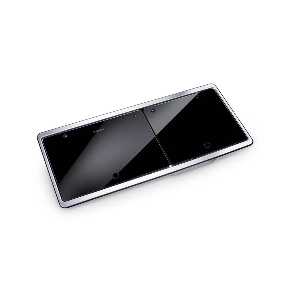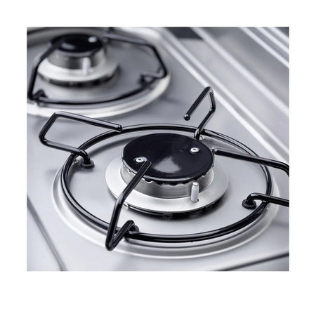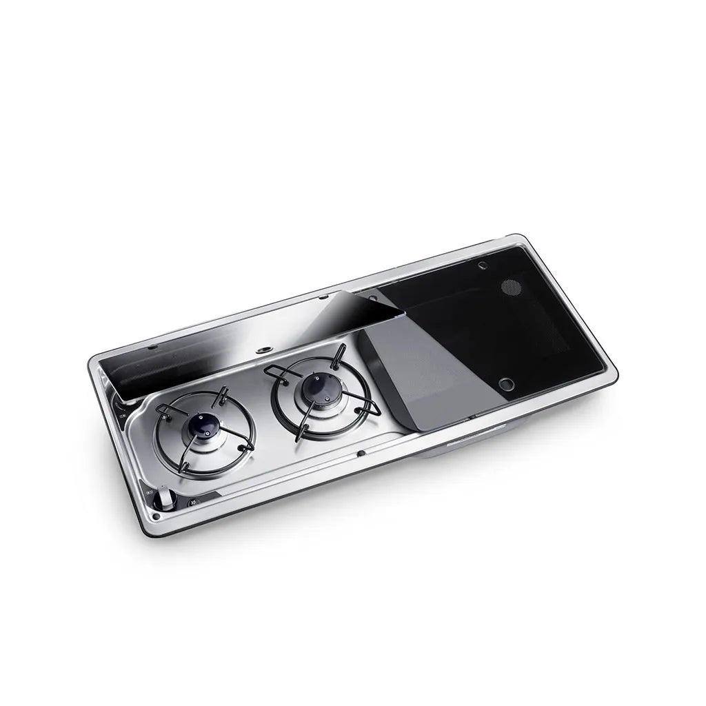 A two-burner gas stove and sink combination unit for RVs. It comes complete with durable safety glass lids that simultaneously provide protection and extra workspace when the unit is not in use.