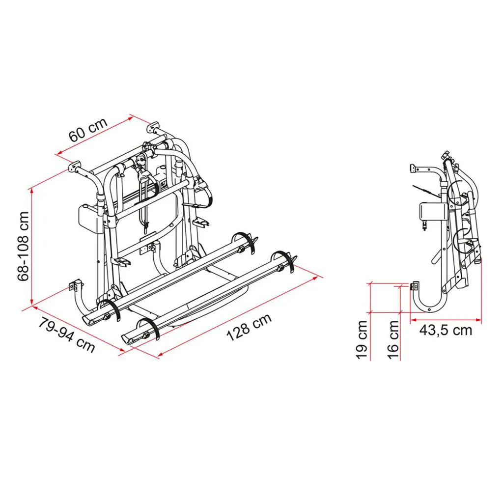This updated version has black plastic trim as opposed to the old traditional red trim model. This bike rack is the only one on the market that has a winch system enabling the bike holding frame to be lowered down as much as 77cm, thus enabling the bikes to be loaded easily. Carries 2 bikes as standard but can be adapted to carry up to 4 bikes. Max load 60KG.