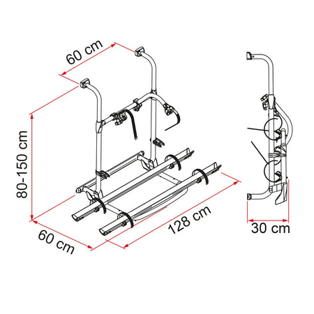 This strong, telescopic bike carrier is the longer version of the Pro line that has a highly adjustable upper structure for better stability. The rounded tube structure is easily adjustable from 80 to 150cm in height to fit different installation requirements.