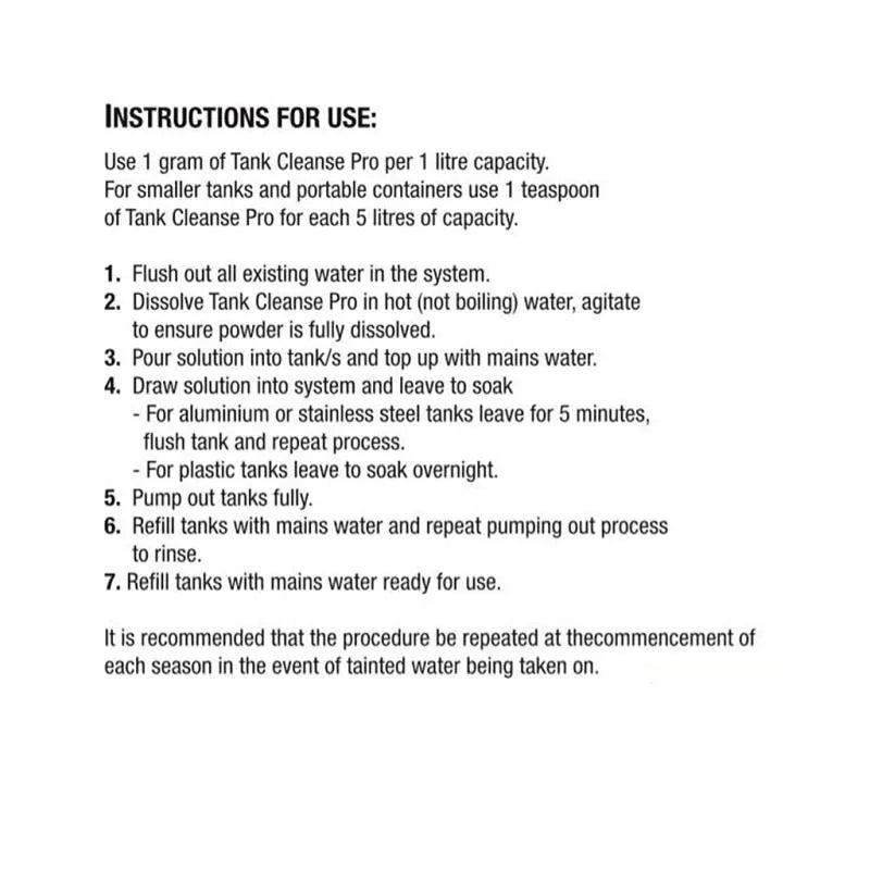 Over time, stagnant water in your RV’s water tank allows for the build-up of algae, mould and other harmful bacteria. Cleanse your freshwater tank for better tasting drinking and cooking water with Tank Cleanse Pro, with 1 teaspoon of Tank Cleanse Pro for each 5L of capacity.