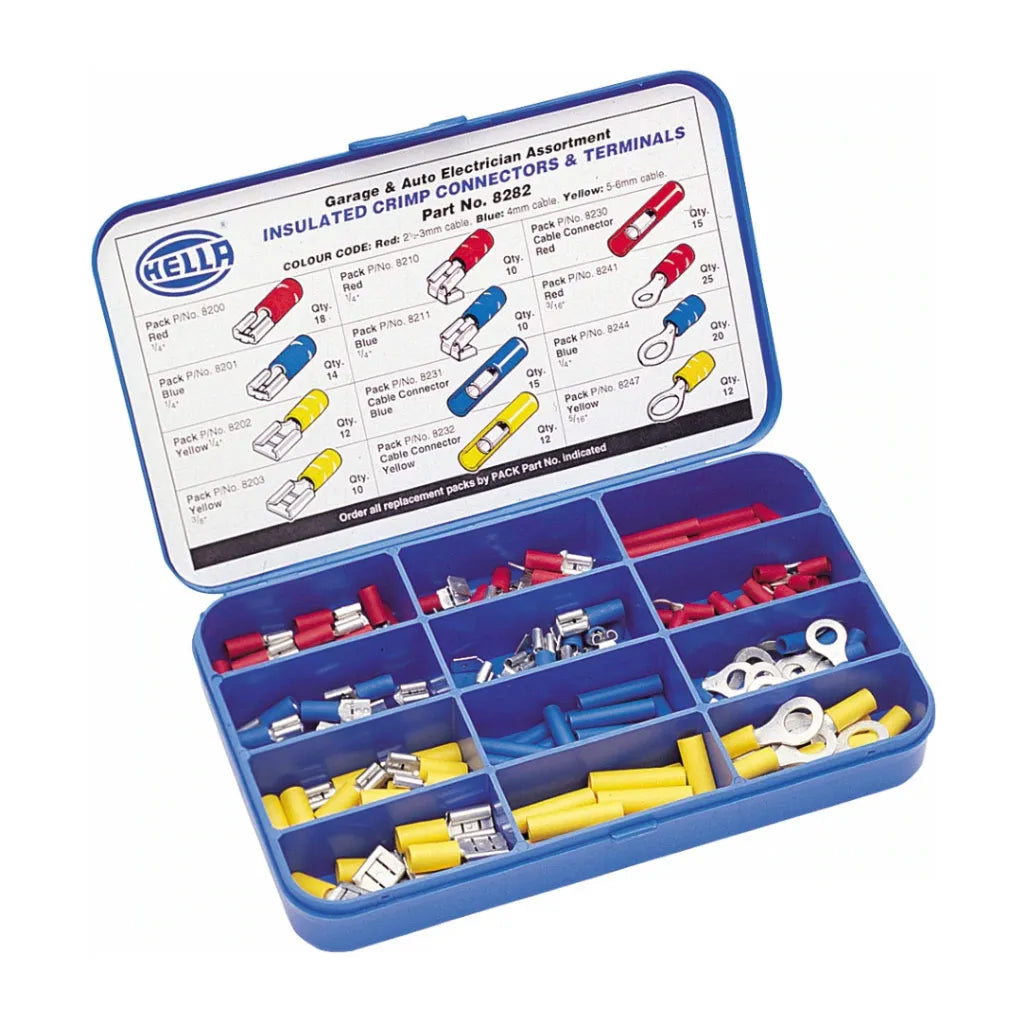 Assortment containing 12 types of HELLA insulated double crimp terminals / connectors specifically designed to meet the requirements of the automotive industry.