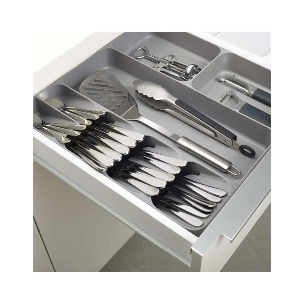 Organise messy utensil and cutlery drawers with this practical and smart storage solution. This unique tray combines five overlapping compartments for storing cutlery with three deep-sided compartments for holding utensils and gadgets. What’s usually stored in two drawers can now be neatly organised into one, creating more space in your kitchen.