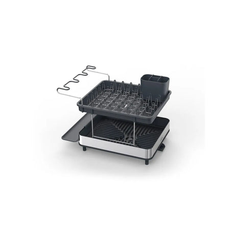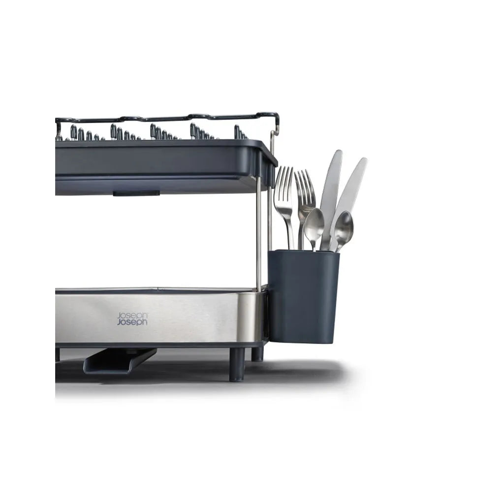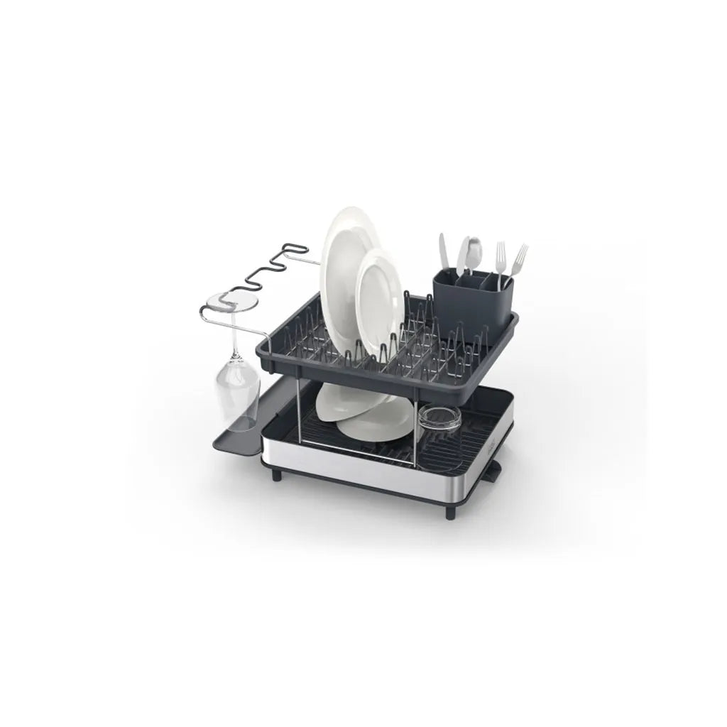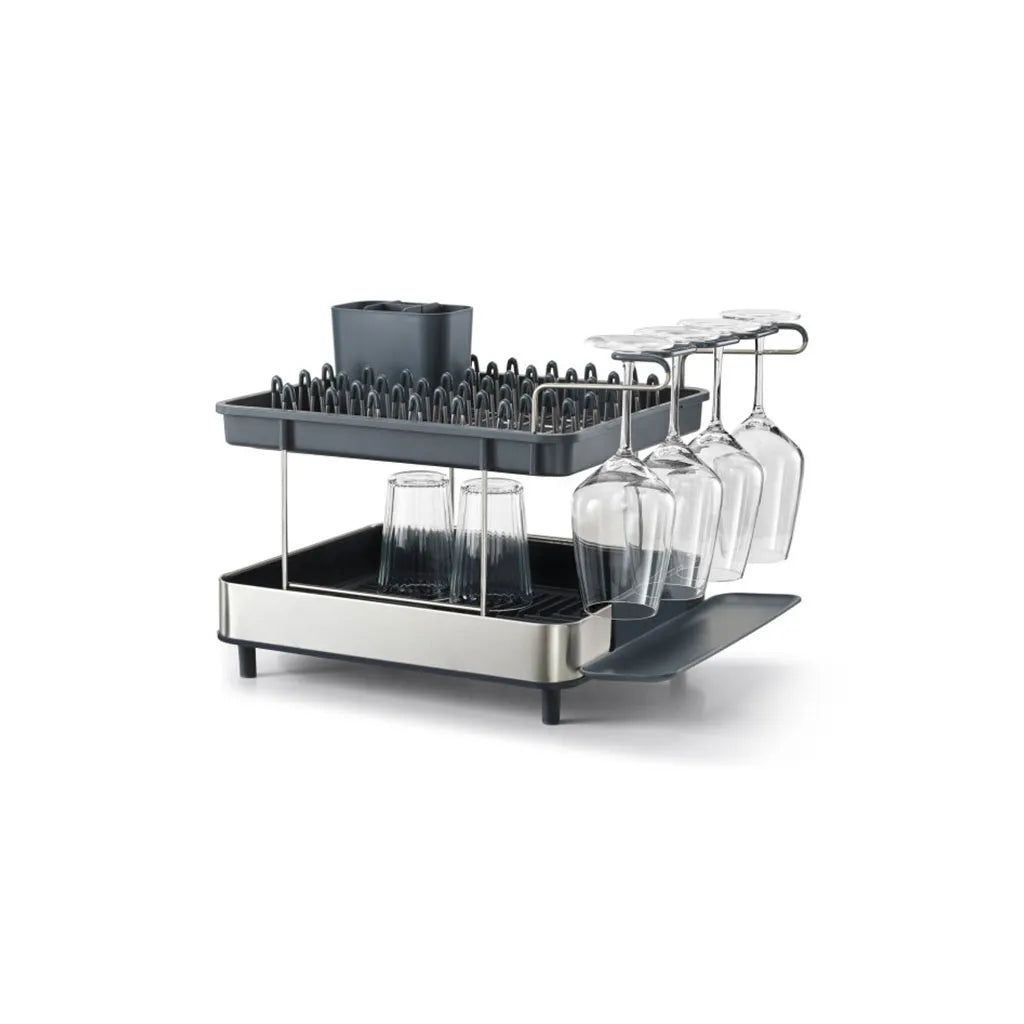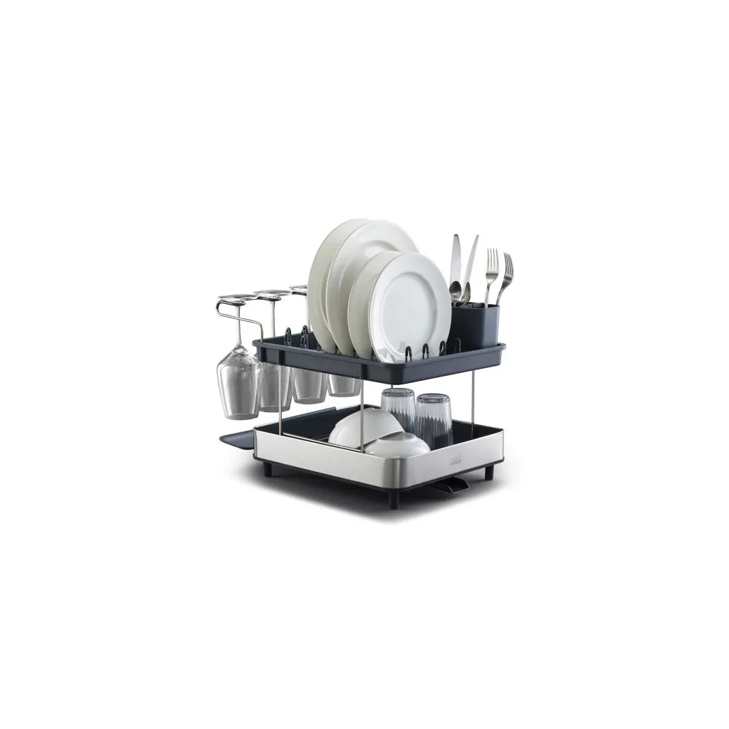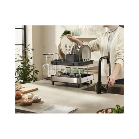 With room around the sink at a premium, this smart dish rack maximises every inch of available space. It features a two-tier design, allowing you to stack lots of washing up in a small footprint and a wine glass holder for safely draining delicate glassware. The moveable cutlery holder can store either inside the top rack or be hooked onto the outside of the lower rack for extra draining space. Raised ribs in the base prevent water from being trapped under cups and bowls and an integrated spout - which can be set at either the front or the side of the unit - allows water to drain straight into the sink. Holds up to four place settings including four tall wine glasses up to H26 x W9 cm (H10.2 x W3.5 inches). Wash and dry by hand.
