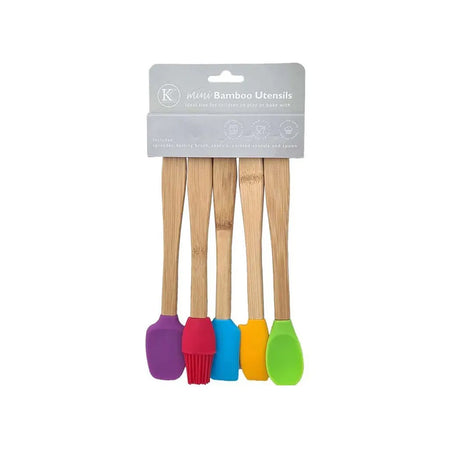 This mini utensil set is the ideal size for children to play or bake with, including a spreader, basting brush, spatula, pointed spatula. Features non-toxic silicone, wooden handle & 5 different utensils.