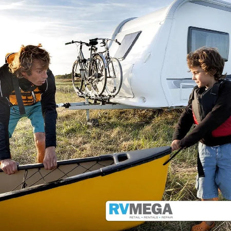 Thule Caravan bike carrier designed for A-Frames, fully tilt-able making easy access to the front locker of the caravan.