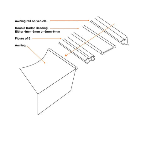 Kador strip - The Air Away comes pre-fitted with a 6mm Kador strip. If there is a pre-attached rail on your vehicle, the awning can be slid directly through it. However, it is recommended using the fixing kit (sold separately) to ensure the Kador fits snugly and to provide flexibility when driving away whilst the Air Awning is still pitched.