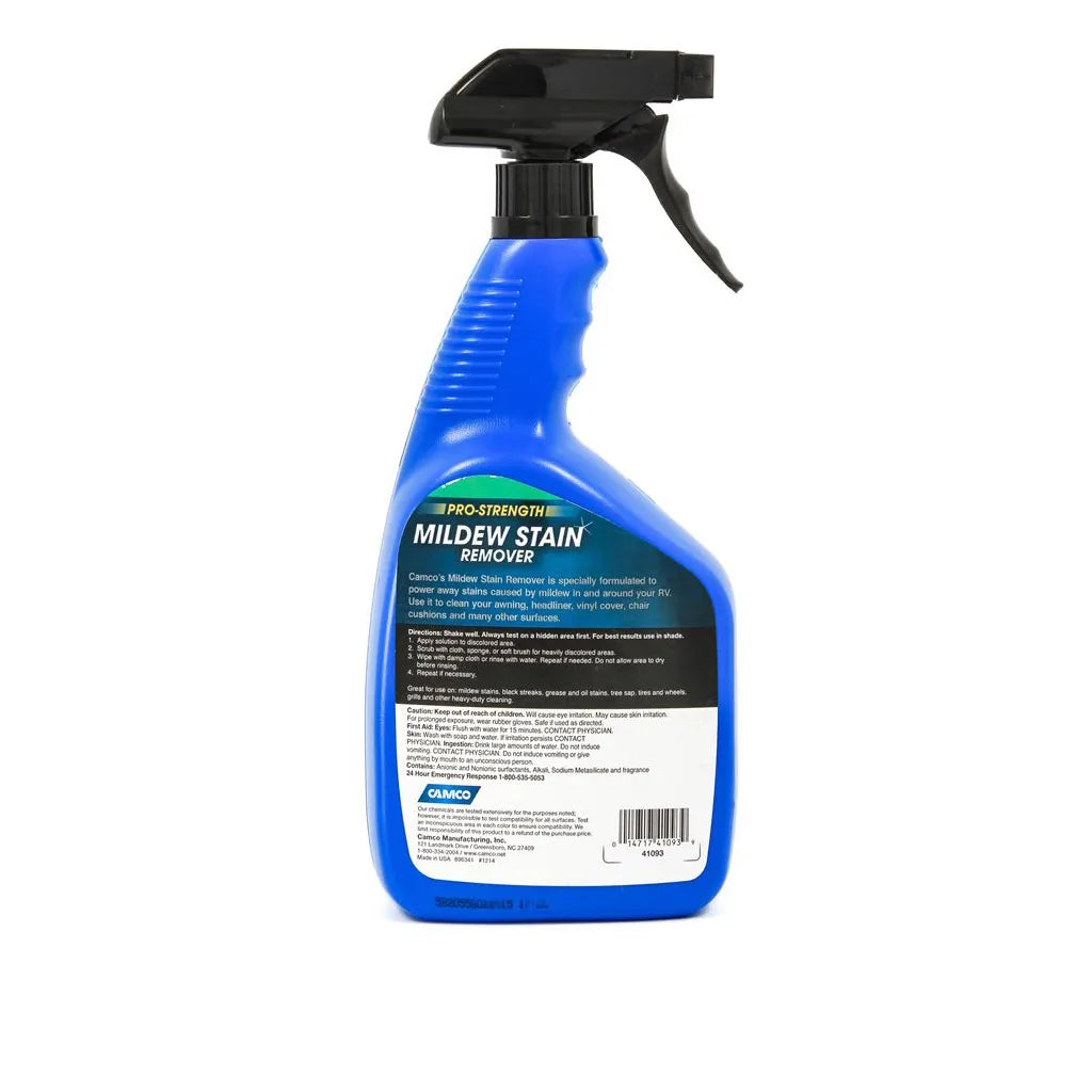 The Camco Pro-Strength Mildew Stain Remover safely cleans mildew stains, black streaks, tree sap, tires and wheels and even grills. It is specially formulated to power away stains caused by mildew in and around your RV. Use it to clean your awning, headliner, vinyl cover, chair cushions and many other surfaces. Breathe new life into your RV and help restore a like-new appearance.