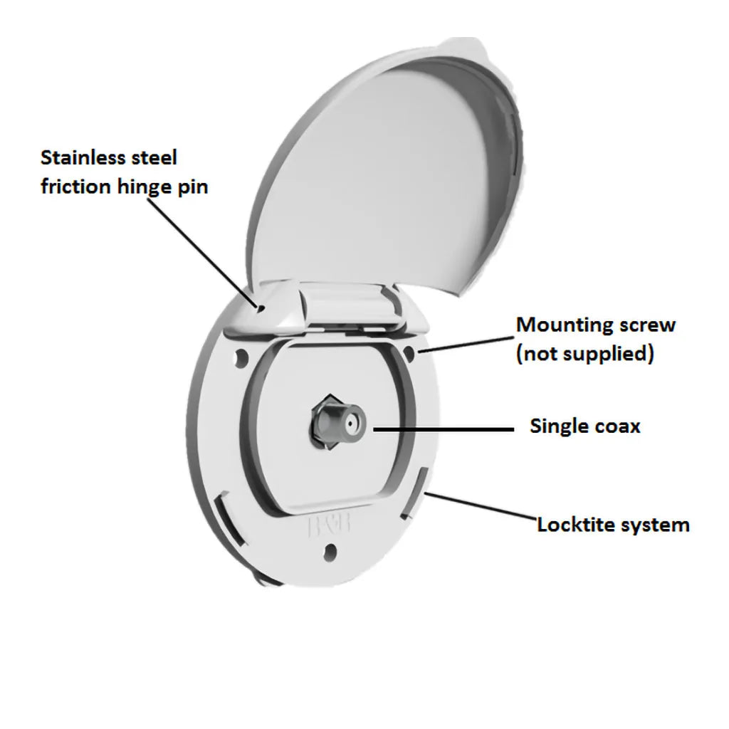 Modern design coax connector with flip up lid for a sleek look for your motorhome, caravan, horse truck, etc.