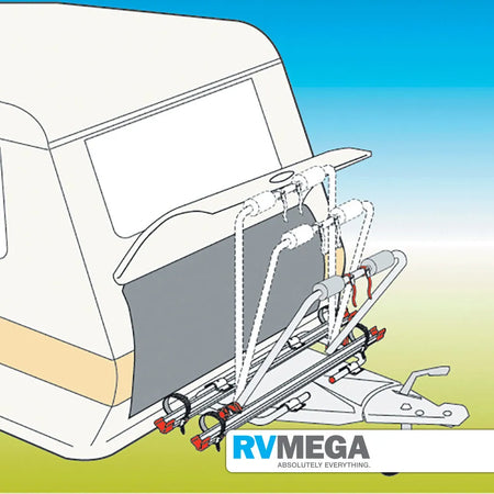 A convenient & compact solution to transport up to two bicycles. It fits all caravans with a standard a-frame & pivots forward allowing access to the storage compartment. Easily installed (no drilling required) & the rail support base has been re-inforced with a new aluminium blocking system.