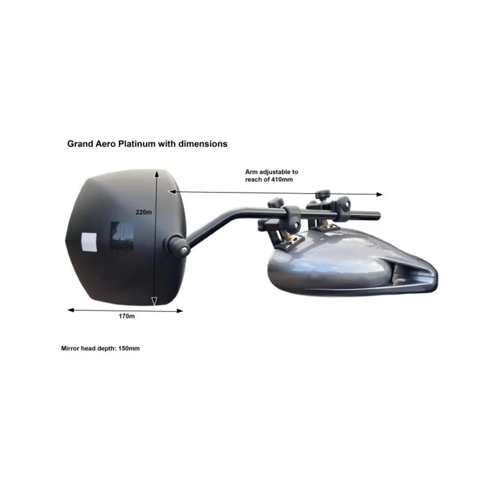 One of the key developments of the Aero Platinum Mirror is the inclusion of new flexible, rubber faced stainless steel, sprung loaded gripper plates. These are over 50% larger than the standard Aero 3 mirror pads. This design enables the gripper to ‘form’ to the shape of the vehicle mirror bezel. This significantly increases the surface contact area, providing improved grip and stability to the towing mirror. The Platinum clamp has also been enlarged, now accepting vehicle mirror bezels up to 25mm in thickness. Also now fitted with a larger diameter arm, this offers even further stability to the mirror, and has adequate reach to be used on caravans up to 2.55 meters wide.