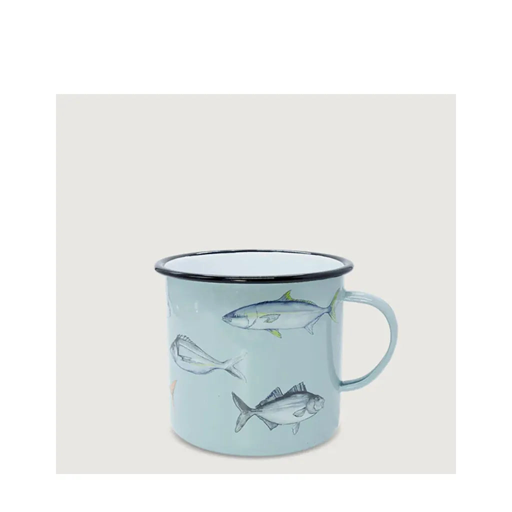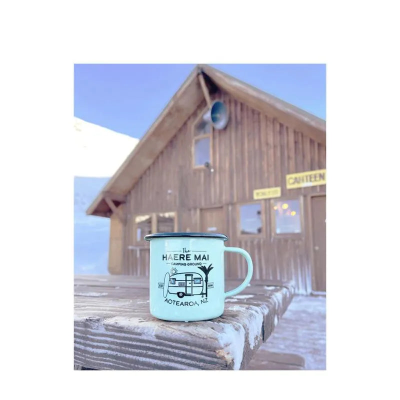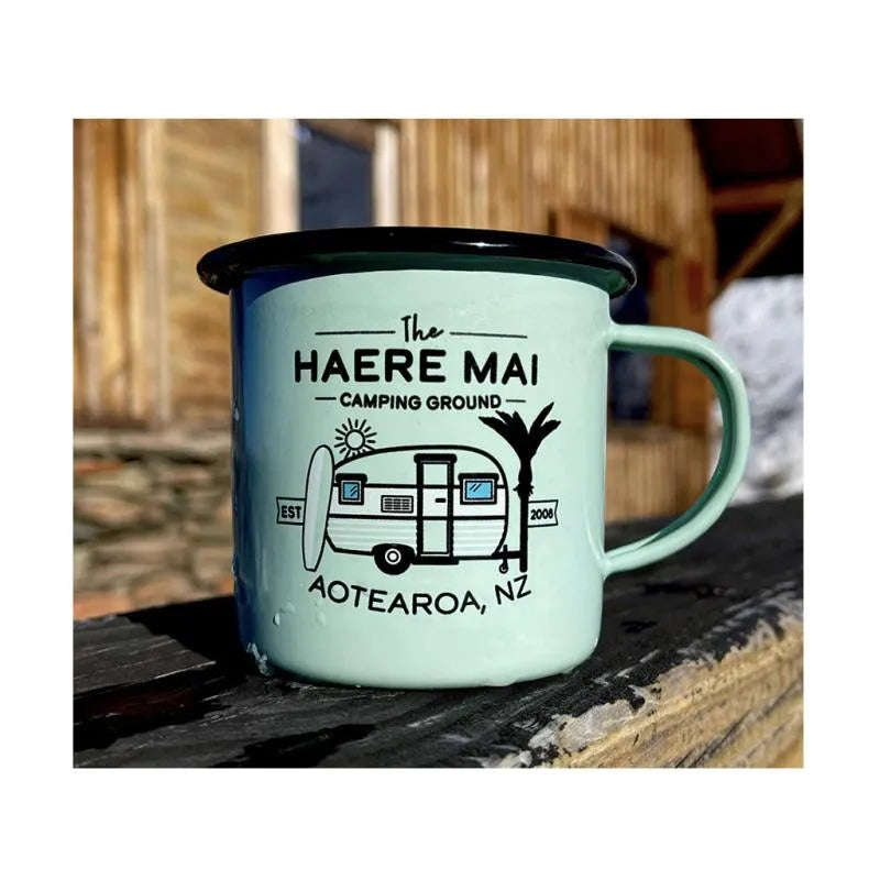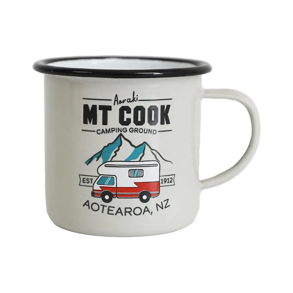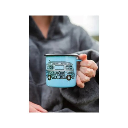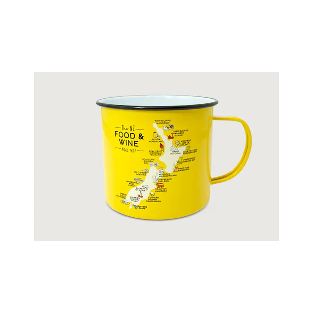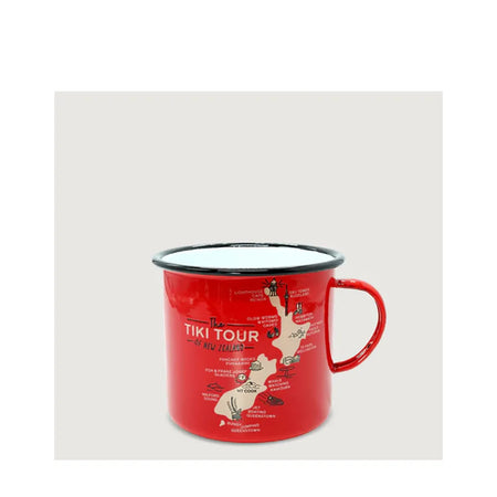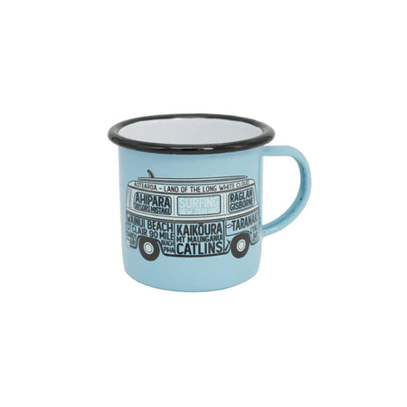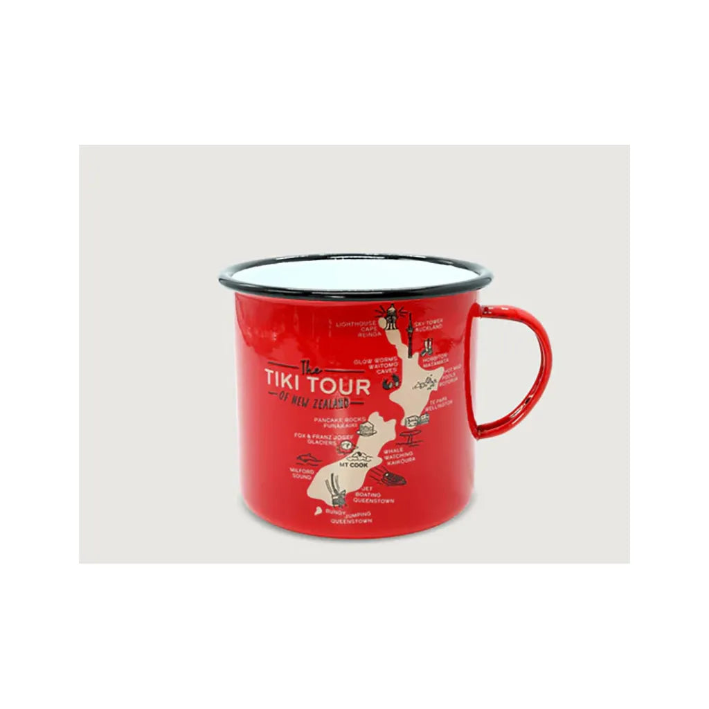 These Moana Road Large Enamel Mugs make a great souvenir or gift featuring various travel illustrations.
