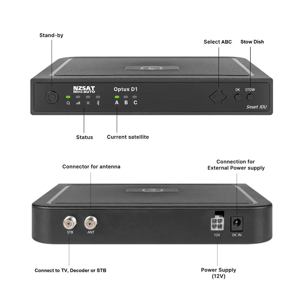 The NZSAT Mini-Auto is a fully automatic RV satellite dish designed for New Zealand. It features a high gain 46cm dish that typically aligns within 2 minutes, a single coax cable solution for easy installation and maintenance, auto shut down on vehicle start up, 12V operation with low power consumption, and lightweight and low-profile design.