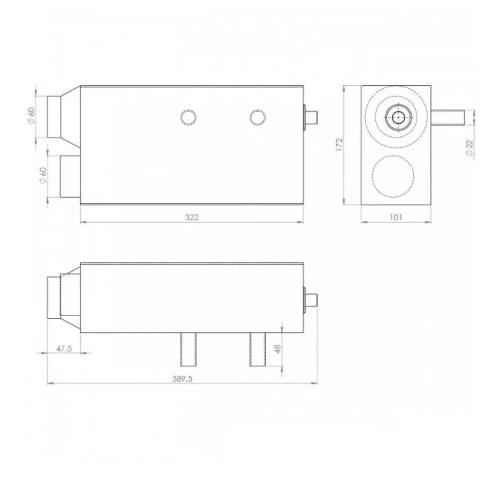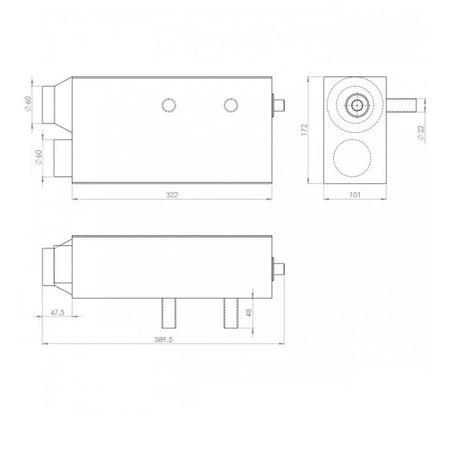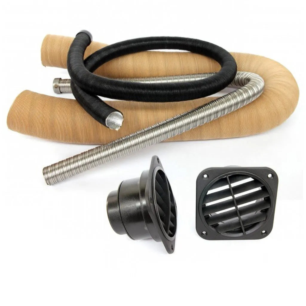 Supplied with a complete fitting kit to suit vehicle applications. In motohomes and caravans the unit is usually mounted under a bench seat or in a cupboard, flued downwards through the floor and out to the side of the vehicle using flexible stainless ducting. The 22mm i.d. ducts are supplied as standard in lengths of 750mm. The ends are finished with neat stainless steel end-caps which comply with EN624. The heat is ducted to one or more outlets through tough highly flexible 60mm ducting. Note: a qualified Gas Fitter is required to install this product