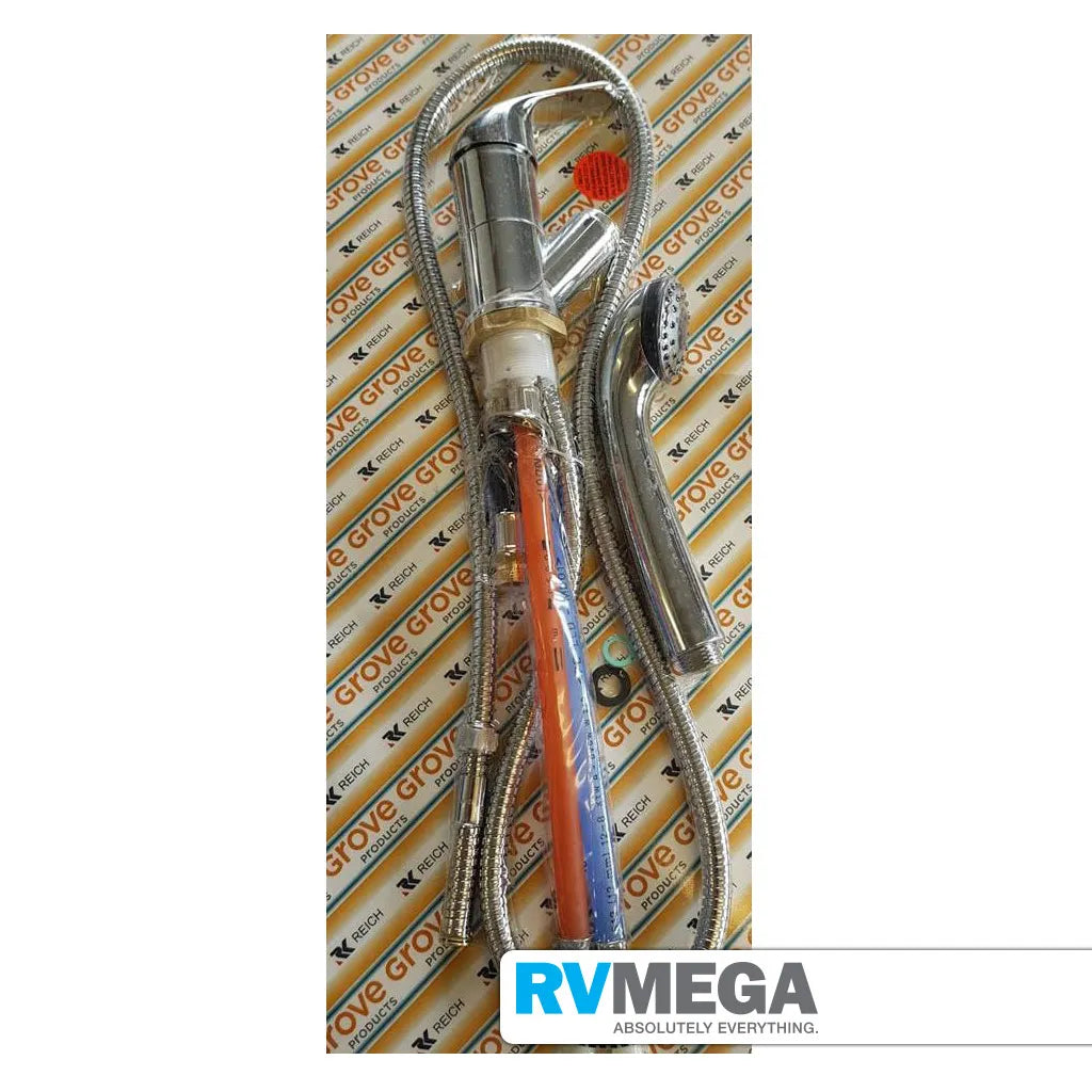 Reich Kama Mixer Tap with Single Lever in chrome with Julia Shower head, is a mono block mixer tap and shower, with pull-out shower head that offers home from home function, contemporary styling and superior quality for any caravan and motorhome washroom.