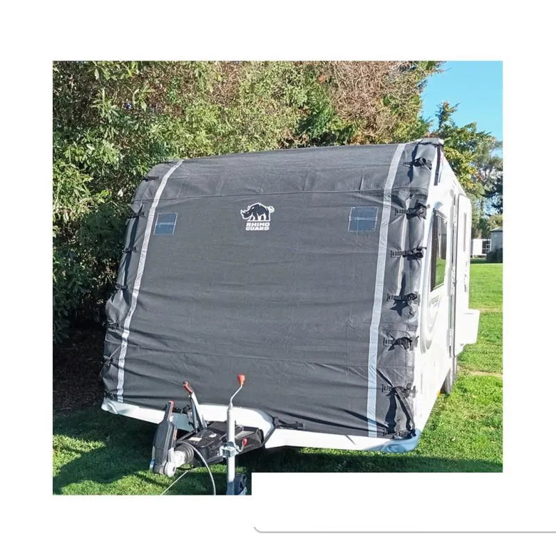 Rhino Guard is a universal caravan front towing covers made from a durable 4 ply non-woven breathable canvas that is soft on the inside and tough on the outside protecting your caravan from chips and damage.