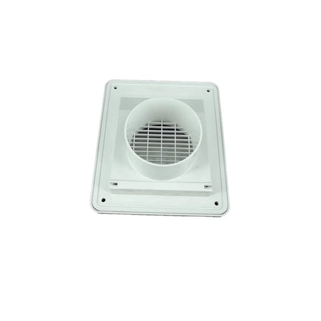 Sleek designed wall vent with 4'' diameter tube is mounted against recreational vehicle side wall to let out hot air. It is designed to allow draining and to keep foreign objects from entering. The simple and smooth outer cover protects the opening and hides the fasteners for a clean appearance.