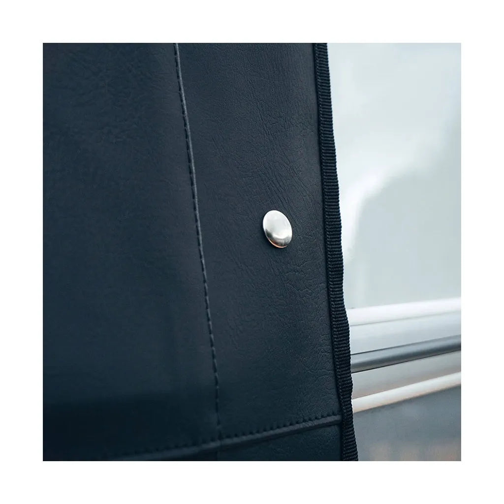 - Designed to fit snugly around the front of the caravan, secured in the upper awning channel and fixed on with 3 snap fasteners on either side.